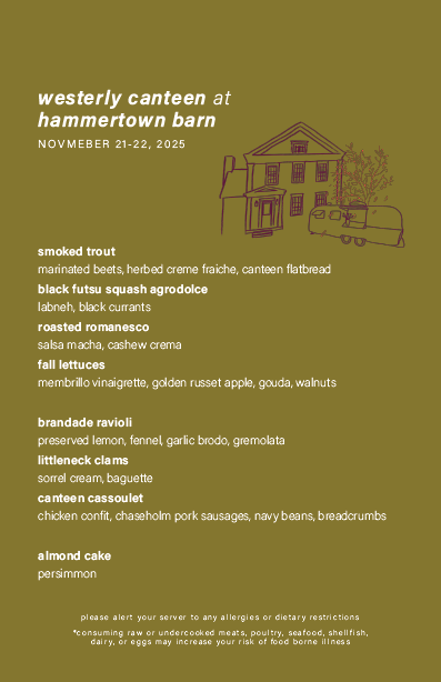 Westerly serves ingredient-driven Hudson Valley fare. Our food is unfussy and rustic, prepared with simple and intuitive cooking practices. We cook with the produce and meat that is available to us from the farms we trust to work with in the area. All produce, meat, and dairy come from the greater Hudson Valley + Tricorner region, and all fish is line or trap caught from NY, MA, CT, and RI.
